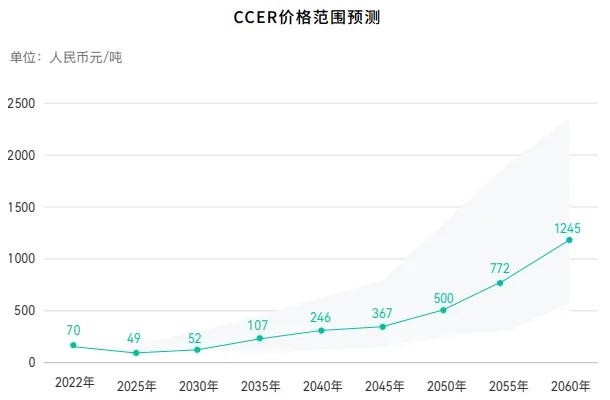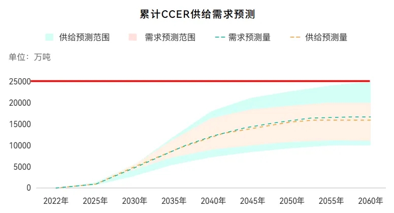 此外,據(jù)碳阻跡發(fā)布的《中國碳價預測報告》中預測的CCER價格范圍預測和累計 CCER 供給需求預測。到2060年中國核證自愿減排量CCER價格達1245元/噸,累計CCER供給需求量為2.5億噸。這將意味著到2060年,我國核證自愿減排量CCER的市場規(guī)模有望超3000億。